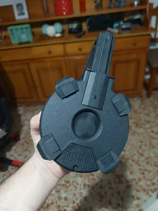 Cargador tipo drum para réplicas de airsoft M4. Incluye batería y cargador. - saigo defense 1.000 bolas de capacidad