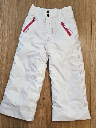 Pantalón impermeable de esquí Wed'ze en color blanco, talla 5 años (104-114 cm) - Cintura elástica que cierra con broches. - Cremalleras laterales en color fucsia. - Costuras decorativas en color fucsia. - Bajos con elásticos (están rozados como se muestra en la foto)
