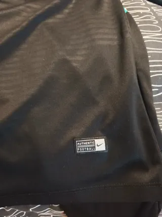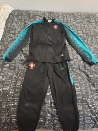 Conjunto deportivo de chándal de la selección de Portugal. - Chaqueta negra con detalles en azul turquesa en las mangas. - Pantalón negro. - Logos de Nike y escudo de Portugal bordados. - Talla M