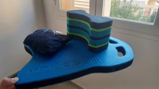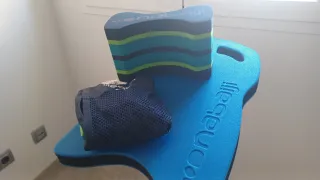 Kit de natación Nabaiji que incluye tabla y pull buoy. - Tabla de natación azul con asas. - Pull buoy azul con rayas verdes y azules.