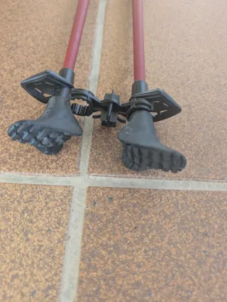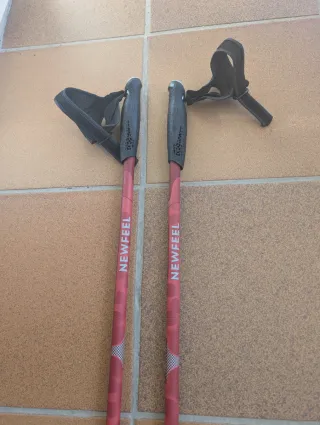 Bastones de marcha nórdica de la marca Newfeel en color burdeos. Fabricados en carbono 50% para mayor ligereza y resistencia. Altura 110 cm. Nuevos , usados una sola vez.