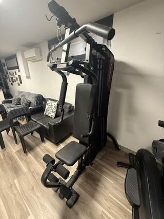 Banco de pesas multifunción para entrenar en casa. Su diseño compacto lo hace ideal para espacios reducidos. - Estructura metálica robusta. - Asiento y respaldo acolchados. - Incluye rodillos para ejercicios de piernas.