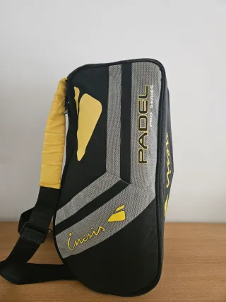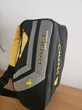 Bolsa de pádel de la marca Genesis, modelo Pro Series. Diseño en color negro con detalles en gris y amarillo. - Compartimento principal espacioso. - Correas acolchadas para llevar como mochila. - Logo de Genesis y Padel Pro Series visibles.