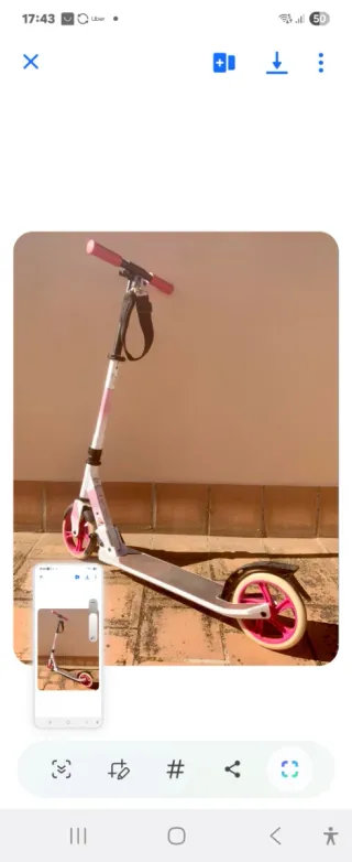 Patinete de la marca OXELO, modelo MID 7, en buen estado. - Color blanco y rosa. - Manillar ajustable. - Ruedas de 175 mm. - Freno trasero. - Plataforma antideslizante.