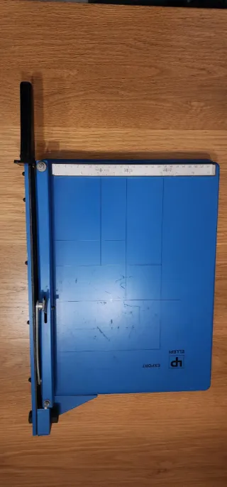 Guillotina de papel de color azul, ideal para cortes precisos. - Base de corte con cuadrícula. - Cuchilla afilada. - Mango ergonómico.