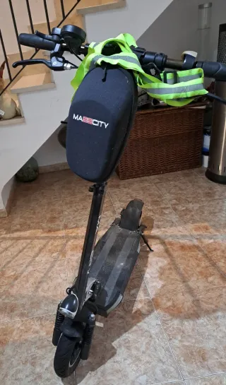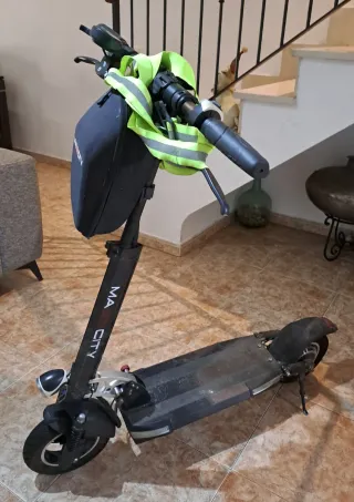 Patinete eléctrico de la marca MASS CITY. - Color negro. - Incluye bolsa delantera. - Chaleco reflectante de alta visibilidad. La batería está perfecta (la pusimos nueva hace poco). Necesita revisar frenos y neumático trasero. Lo compramos nuevo en Turbo Hobby y nos costó 570€. Tiene cuenta kilómetros y tres modos de conducción.