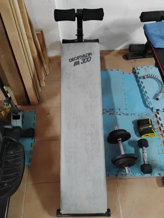 Banco de abdominales Decathlon PA 300. - Tapicería gris. - Estructura negra. - Rodillos para tobillos.
