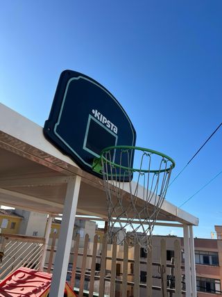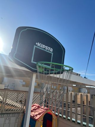 Canasta de baloncesto de la marca Kipsta, ideal para exteriores. - Aro verde. - Tablero negro con detalles en verde. - Red de baloncesto.