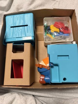 Las gafas esta un poco rota por la parte de abajo de la goma. Al cerdito le falta una hamburguesa