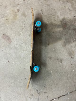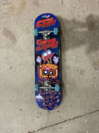 Monopatín con un diseño divertido inspirado en los años 80. - Gráficos de cassette y cinta. - Ruedas azules.