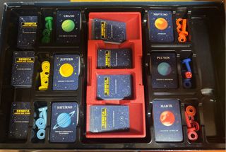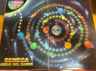 Juego de mesa educativo Seneca El Juego del Saber, con temática espacial y planetaria. - Diseño con órbitas planetarias y planetas como Júpiter, Saturno, Urano, Neptuno, Plutón y la Tierra. - Tablero con casillas de colores y formas (triángulos y círculos). - Ilustraciones de galaxias y paisajes espaciales.