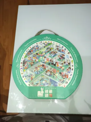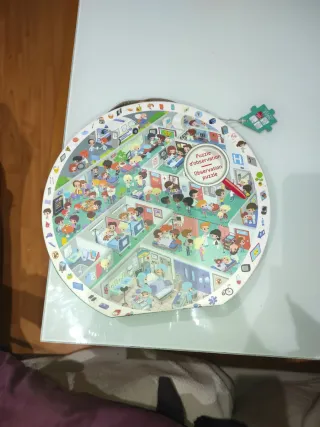 Puzzle redondo con temática de hospital y actividades de observación. Ideal para desarrollar la atención y la paciencia. - Diseño circular. - Ilustraciones detalladas de un hospital. - Incluye plantilla con algún deterioro por el uso que no impide su función.
