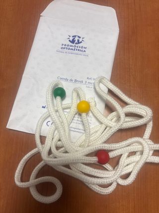 Cuerda de entrenamiento visual de 3 metros de longitud, utilizada en optometría. - Incluye tres cuentas de colores (verde, amarillo y rojo). - Material de entrenamiento visual. -Sin estrenar