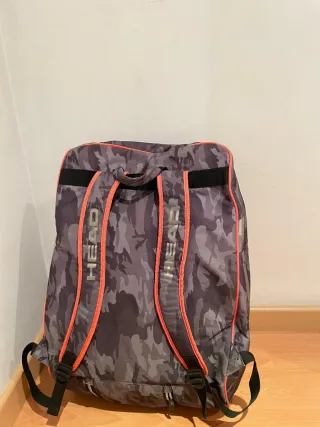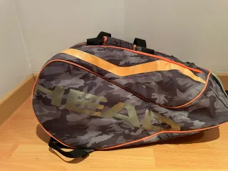 Paletero de la marca HEAD con un diseño de camuflaje en tonos grises y detalles en naranja. - Diseño de camuflaje. - Ribetes en color naranja. - Logo de HEAD en grande.