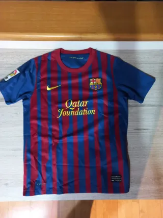 Camiseta de fútbol del FC Barcelona con el patrocinio de Qatar Foundation. Diseño clásico a rayas rojas y azules. - Escudo del FC Barcelona. - Logo de Nike. - Detalle de Qatar Foundation en la parte frontal.