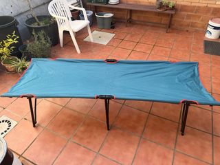 Cama plegable de camping, ideal para exteriores. Fácil de montar y transportar. - Estructura de metal resistente. - Tejido de lona azul. - Bordes reforzados en color naranja.