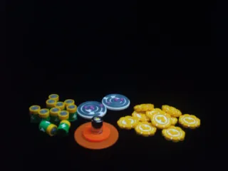 Set de componentes para juegos de mesa. - Fichas amarillas creditos - Componentes tipo batería energia - Rotaciones - soporte sol con luz led.