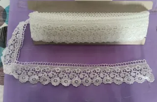 Preciosa puntilla de guipur en color blanco. Ideal para adornar prendas, cortinas, toallas o proyectos de manualidades. - Se presenta en rollo de 13,50m. - Ancho 5,5cm - Diseño floral. - Borde festoneado.