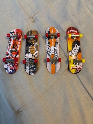 Set de cuatro mini patinetes, también conocidos como fingerboards. Perfectos para practicar trucos. - Diseño con lija negra. - Ruedas de color rojo y amarillo.