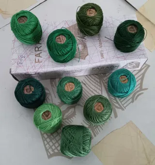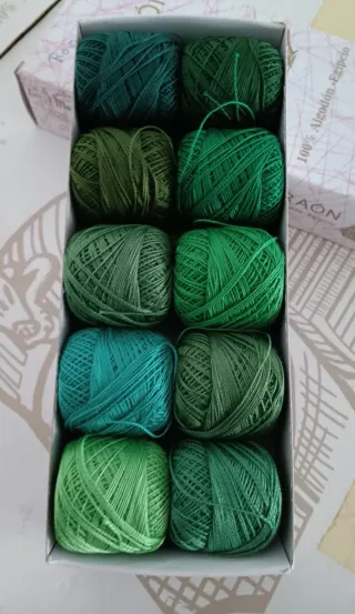 Lote de ovillitos de algodón perlé de la marca Faraón. - Algodón 100% Egipcio. - Cada ovillo pesa 5 gramos. - Varios tonos de verde.