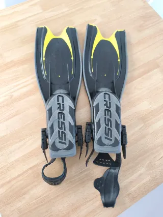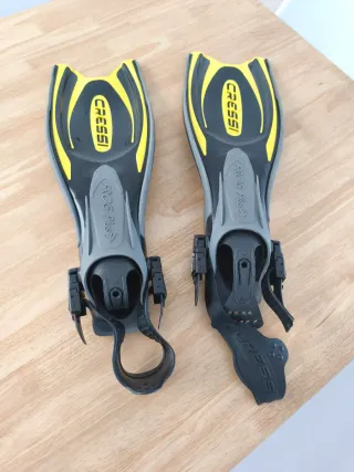 Aletas de buceo Cressi Frog talla XS-S. Ideales para buceo y snorkel. Como nuevas, compradas por error de talla, aún con funda original y soporte moldeador para almacenaje. Diseñadas para ofrecer comodidad y rendimiento. - Color negro y amarillo. - Pala de goma. - Hebillas de ajuste.