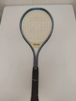Raqueta de tenis Honeyll de aluminio. - Marco de color azul. - Cuerdas de color crema. - Empuñadura negra.