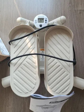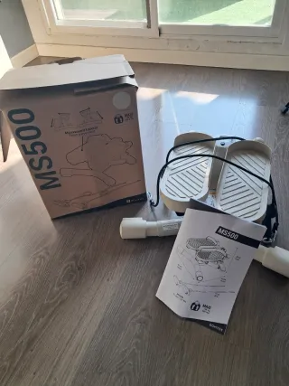 Stepper MS500 de Domyos, ideal para ejercicio en casa. Incluye instrucciones y accesorios. - Movimiento lateral. - Peso máximo de usuario: 100 kg. - Incluye instrucciones de uso.