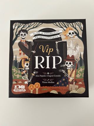 Juego de mesa VIP RIP de Zombi Paella. Un juego de celebridades y frases lapidarias. - Diseñado por Eloi Pujadas i Eugeni Castaño. - Ilustrado por Víctor Medina.