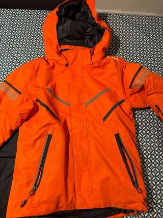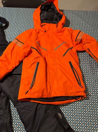 Conjunto de esquí para niño de 7 años. - Chaqueta de color naranja brillante. - Pantalón negro. - Detalles reflectantes en mangas y pecho.