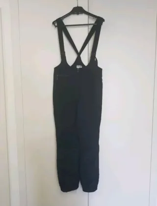 Pantalón de esquí negro talla 42 con tirantes ajustables de buena calidad. - Rodilleras bien acolchadas. - Diseño con cremalleras. - Tejido resistente. - Marca FUS EUROP. - Cálido y cómodo.