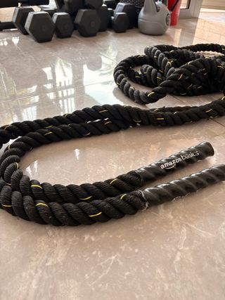 Cuerdas de batalla negras con detalles amarillos, ideales para entrenamientos de fuerza, CrossFit y funcional. Cuentan con mangos ergonómicos para un agarre cómodo. Nueva - Marca: Amazon Basics - Color: Negro con detalles amarillos - Material: Cuerda trenzada resistente - Mangos: Cubiertos para mejor agarre