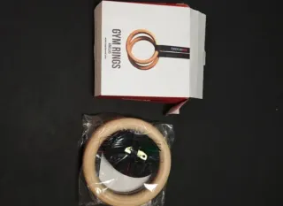 Juego de anillas de madera para entrenamiento de CrossFit y gimnasio. Perfectas para ejercicios de fuerza y resistencia. - Material: Madera natural. - Incluye correas ajustables.