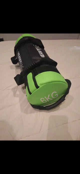 Saco de entrenamiento de 6kg, ideal para ejercicios de fuerza y acondicionamiento físico. Su diseño es moderno y funcional. Saco búlgaro. Crossfit, fitness - Color: Negro con detalles en verde lima. - Material: Tela resistente y asas ergonómicas para un agarre cómodo. - Peso: 6 kg.