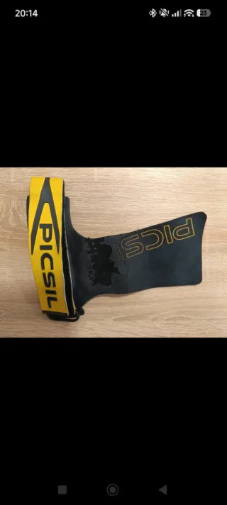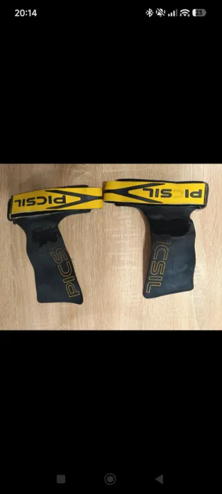 Calleras Picsil para entrenamiento de gimnasio y crossfit (sin agujeros). Diseñadas para un agarre seguro y cómodo. - Material: Cuero y tela. - Color: Negro y amarillo. - Marca: Picsil. Están algo peladas pero siguen funcionando bien. Talla L.