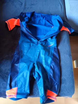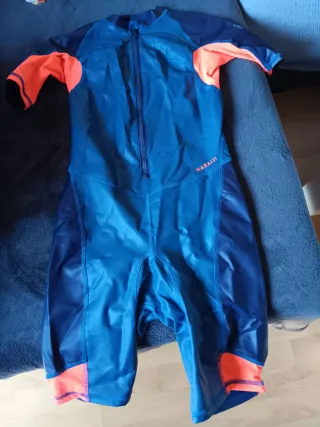 Traje de neopreno de manga corta y pernera corta. - Color azul marino y naranja. - Cremallera frontal completa. - Marca Nabaiji.