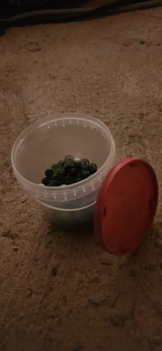 Bote transparente con tapa roja que contiene canicas de cristal de varios colores, incluyendo verdes y azules. - Canicas de cristal. - Bote de plástico. - Tapa roja.