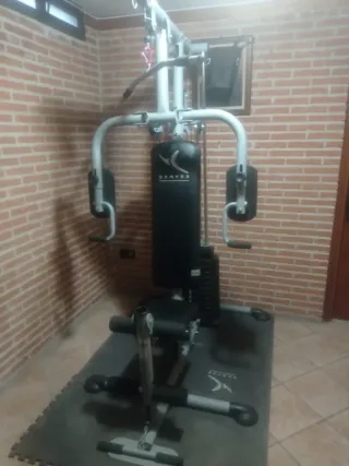 Multigimnasio de la marca Domyos, ideal para entrenar en casa. - Estructura robusta y estable. - Incluye pesas para ajustar la resistencia. - Asiento acolchado para mayor comodidad.