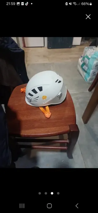 Casco de escalada de color blanco con correas naranjas. - Sistema de ajuste interior. - Correas de barbilla ajustables.