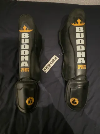 Espinilleras de la marca Buddha Sports, diseñadas para la práctica de la lucha. - Color negro. - Logo de la marca en color dorado. - Cierre ajustable.