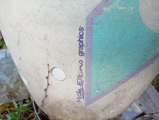 Tabla de surf que necesita una restauración. Ideal para proyectos de bricolaje o para quienes disfrutan de renovar equipos. - Diseño clásico con detalles gráficos. - Quilla central incluida.