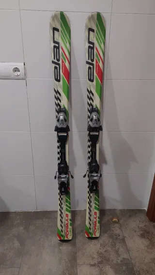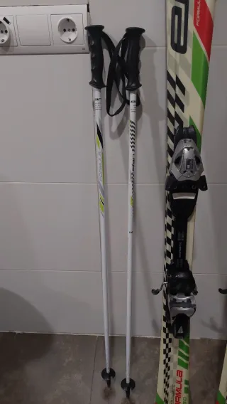 Esquís Elan Formula de 130 cm de longitud. Diseñados con un patrón de líneas verdes, rojas y blancas. - Fijaciones Elan incluidas. - Diseño con patrón a cuadros en la parte inferior. Bastones 100 cm