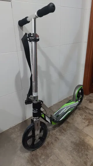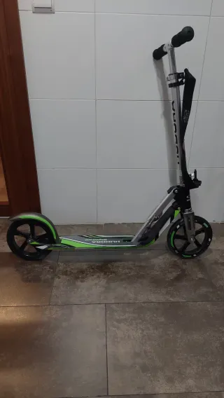 Patinete de la marca HUDORA, modelo BigWheel 205. Diseñado para ofrecer una experiencia de patinaje ágil y divertida. - Ruedas grandes de 205 mm. - Plataforma ancha para mayor comodidad. - Manillar ajustable en altura. - Freno trasero. - Diseño moderno en gris y verde.