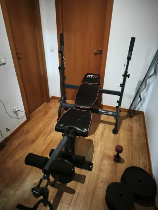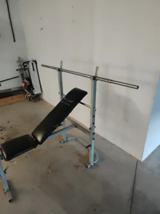 Banco de ejercicios multifuncional con barra. - Banco con respaldo y asiento acolchados. - Barra recta. - Sin pesas.