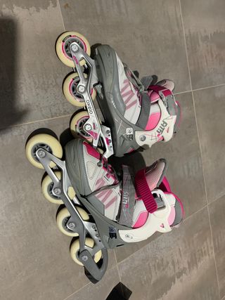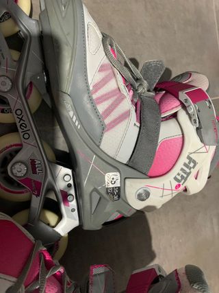 Patines en línea Oxelo en color gris y rosa. - Bota cómoda y ajustable. - Ruedas de 76mm. - Cierre de velcro y cordones.