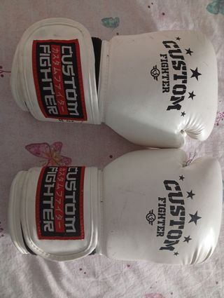 Guantes de boxeo de la marca Custom Fighter, ideales para niños. Son de color blanco y tienen un diseño llamativo. - Cierre de velcro. - Relleno protector. - Talla 8oz.