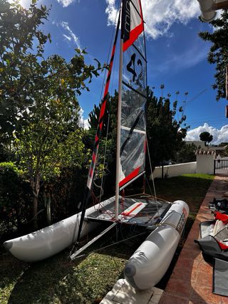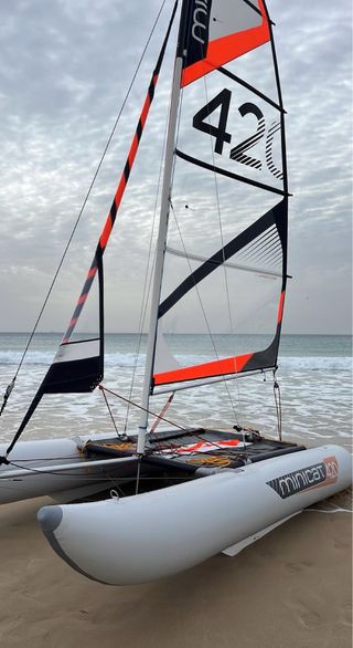 Catamarán hinchable Minicat M420 Evoque en excelente estado, casi nuevo. Es un catamarán muy divertido, rápido y estable. Perfecto tanto para iniciarse como para quien ya tenga experiencia en vela ligera y quiera algo práctico sin necesidad de amarre ni remolque. - Diseño moderno con detalles en naranja y negro. - Marca: Minicat Evoque 420 ✔️ Todavía le queda 1 año de garantía oficial ✔️ 6 años de garantía en los pontones hinchables ✔️ Montaje rápido y transporte muy cómodo (se desmonta y cabe en bolsas) ✔️ Ideal para playa, lago o escapadas en verano