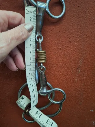 2 Filetes para caballo de metal. No 1 perfecto - en 3 partes. No 2 tiene un poco de corosion y pieza central con rodillos. Los 2 tienen 13,5 cm entre los anillos.
