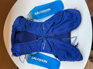 Chaleco de hidratación Salomon Skin 12 en color azul, ideal para trail running. Incluye dos soft flasks. - Chaleco de hidratación Salomon. - Modelo: Skin 12. - Color: Azul. - Incluye 2 soft flasks.