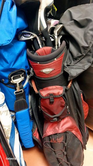 Set de golf Wilson con bolsa. - Bolsa de golf negra con detalles amarillos y grises. - Incluye varios palos de golf con protectores. - Marca Wilson visible en la bolsa.