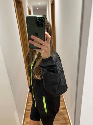 Chaqueta impermeable ligera de color negro con detalles en verde neón. Cuenta con capucha y cremallera frontal. - Capucha integrada. - Cremallera frontal. - Bolsillos con cremallera.